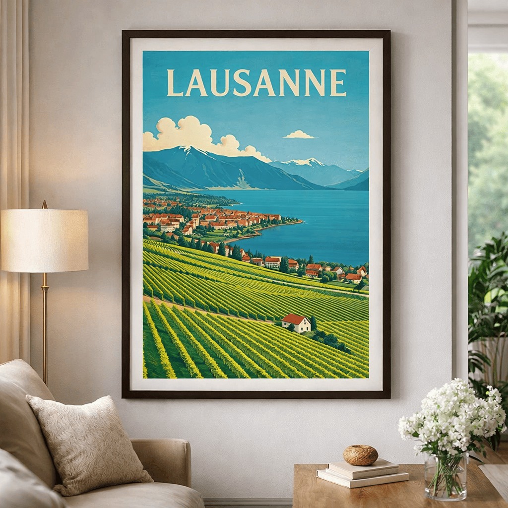 Pour mettre en valeur votre Affiche Lausanne Panorama, envisagez de l'accrocher dans un salon ou un bureau lumineux où elle pourra rayonner pleinement. Associez-la avec des accents boisés ou des textiles naturels pour créer une ambiance chaleureuse et invitante. Un cadre simple mais élégant mettra en avant ses couleurs vibrantes tout en respectant son style moderne.