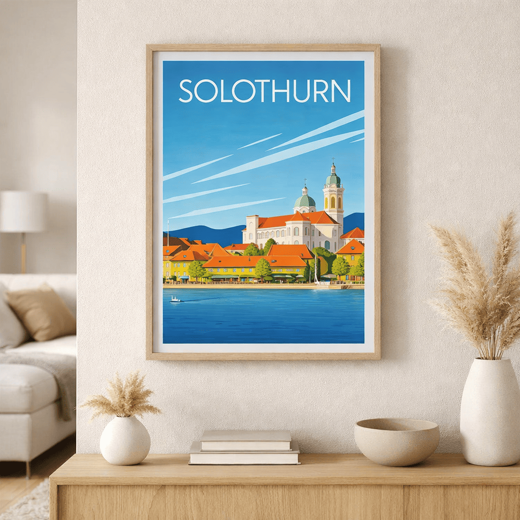 Situé dans un écrin naturel fascinant, Solothurn combine charme architectural et beauté paysagère. La ville est réputée pour son riche patrimoine historique et culturel qui attire chaque année bon nombre de visiteurs curieux d'explorer ses trésors cachés. Cette affiche capture non seulement son essence mais aussi le mouvement vif qui anime ses rives en été : promeneurs enjoués et artisans locaux animent les marchés alentours.