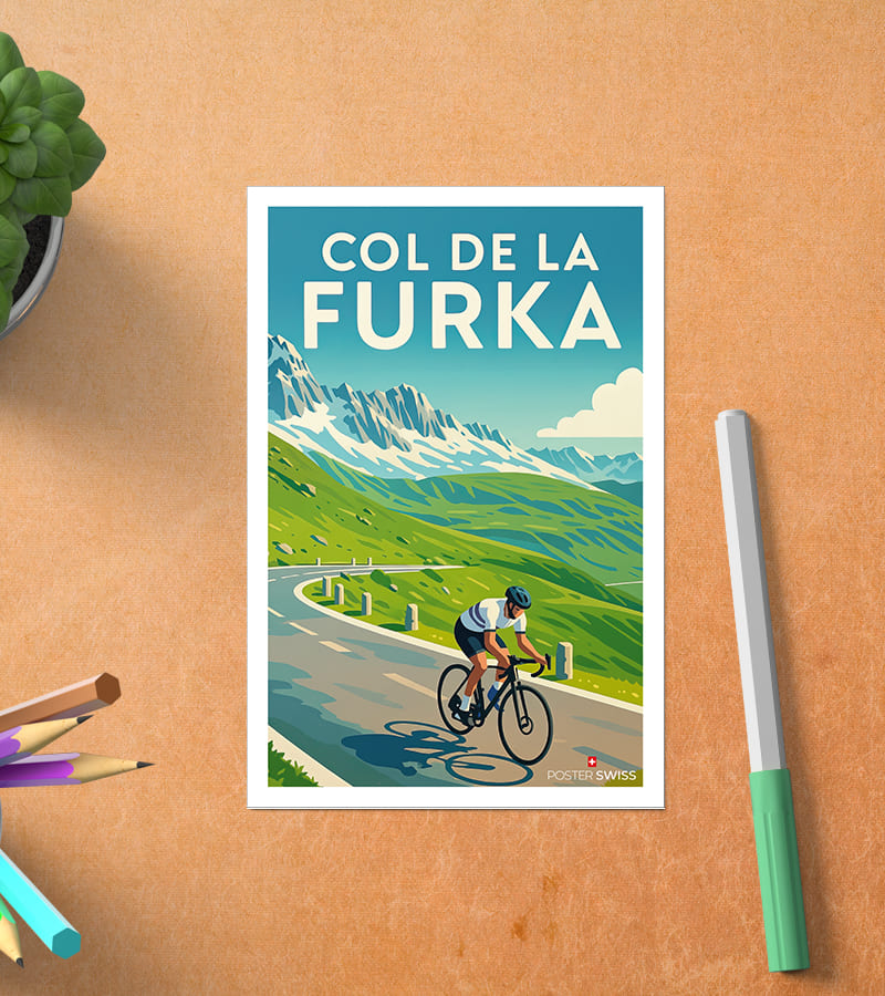 Illustrée avec réalisme et élégance, cette carte postale Col de la Furka met en valeur les lacets spectaculaires de la route, les pics enneigés et les vallées profondes. Chaque détail de cette carte postale Col de la Furka évoque la liberté, l’aventure et la beauté brute des Alpes suisses.