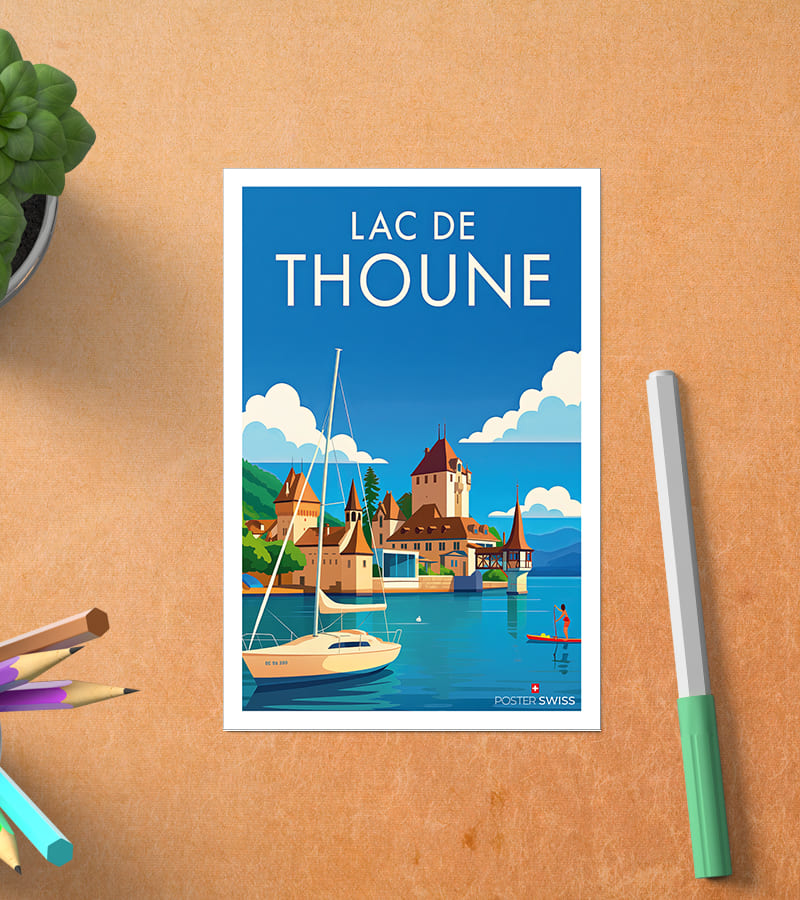 Chaque carte postale Lac de Thoune met en lumière les paysages enchanteurs de la région : les rives fleuries, les châteaux historiques et les montagnes enneigées qui se reflètent dans le lac. La carte postale Lac de Thoune restitue fidèlement la poésie visuelle de ce site unique, véritable symbole du romantisme et de la pureté alpine.