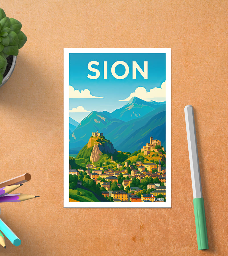 Plongez dans l’atmosphère riche en histoire et en charme de Sion grâce à cette superbe carte postale Sion. Capitale du Valais, la ville séduit par ses collines dominées par les châteaux de Valère et Tourbillon, ses ruelles pittoresques et son patrimoine culturel unique. Chaque carte postale Sion capture l’authenticité et la beauté intemporelle de cette cité valaisanne.